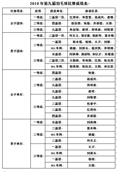 場上隊員聚精會神、拼盡全力,場下觀眾掌聲不斷、歡呼雀躍,充分展現(xiàn)了公司員工奮勇爭先、努力拼搏的精神面貌。經(jīng)過激烈的比拼,張敏、劉洪濤一路披荊斬棘、過關(guān)斬將,分別獲得女子單打一等獎和男子單打一等獎;男子團(tuán)體一等獎和女子團(tuán)體一等獎分別被二基層男子一隊、二基層女子一隊收入囊中。